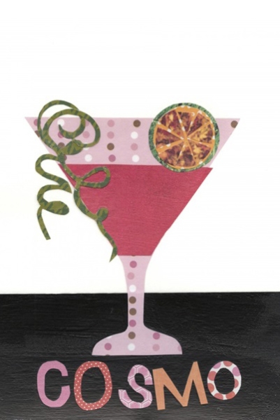 Ein Kunstdruck einer Illustration eines Martiniglases mit Limettenscheibe und Limettenzeste verziert. Wie eine Collage sind die Formen des Glases und der Früchte ausgeschnitten und auf den Hintergrund in schwarz-weiß geklebt. Ein cooles Poster für die Minibar.