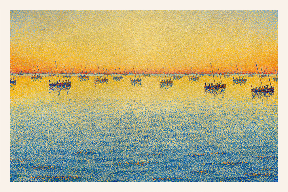 Wunderschöner Sonnenuntergang über dem Mittelmeer und den darauf ankernden Fischerbooten. Dieses klassisch impressionistische Meisterwerk von einem der bedeutendsten Künstler des Neo-impressionismus Paul Signac, strahlt mediterrane Romantik aus. Dieses schöne Bild als gerahmter Kunstdruck ist eine Augenweide und ein Hingucker über jeder Couch oder in der Bilderwand.