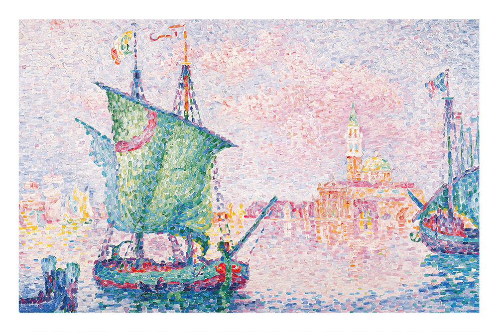 Pointillistisch, impressionistisches Bild des bekannten Malers Paul Signac. Das Motiv zeigt ein Segelboot auf den Gewässern vor Venedig. Das grüne Segel und der Rote Schiffskörper bilden einen schönen, sanften Kontrast mit den in pastelliges Blau, Gelb und Rosa gehaltenen Hintergrund. Als hochwertiger Kunstdruck im Wohnzimmer, lädt es den Betrachter immer wieder zu einer Tagtraum-Reise nach Venedig ein.